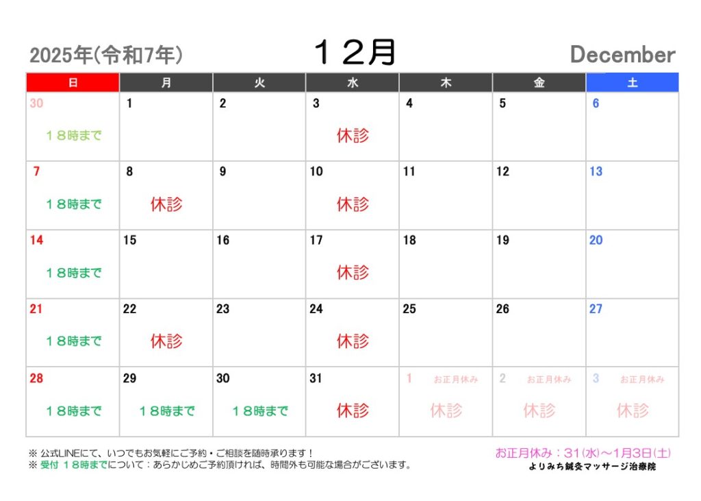 ・お正月休み:12月31日(水)~1月3日(土)